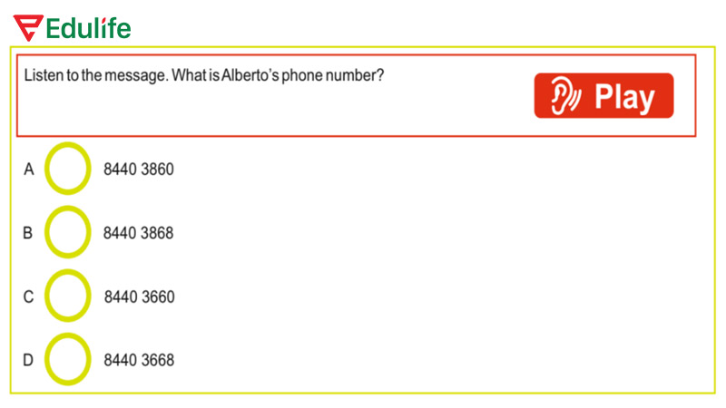 - Dạng bài: Phần “Nhận biết số và từ”, trong đó người dự thi sẽ nghe một tin thoại ngắn và cần xác định các thông tin cụ thể như số (điện thoại, thời gian, …) hoặc một từ và trả lời các câu hỏi về thông tin cụ thể được nghe. Câu hỏi yêu cầu xác định một con số hoặc một từ cụ thể trong bài nghe.