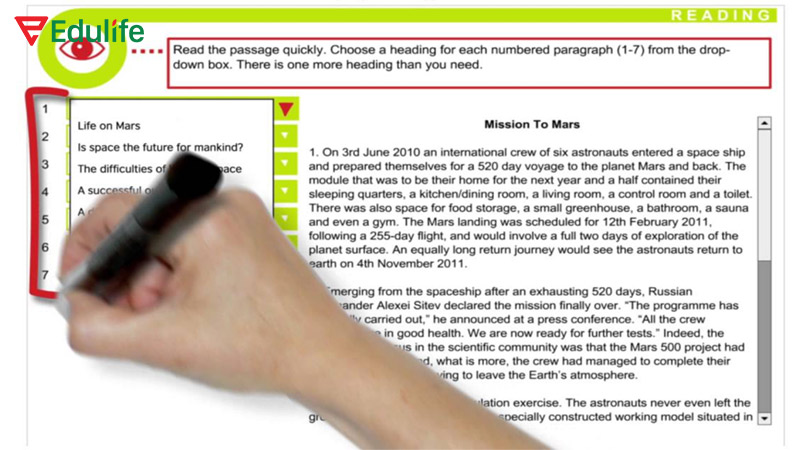Đây là phần khó nhất trong mục Reading của Aptis bởi nó yêu cầu khả năng đọc hiểu văn bản dài và toàn diện. Bạn không chỉ cần hiểu từng đoạn văn một cách riêng lẻ, mà còn phải thể hiện việc hiểu rõ mối liên hệ giữa tiêu đề và nội dung của từng đoạn.