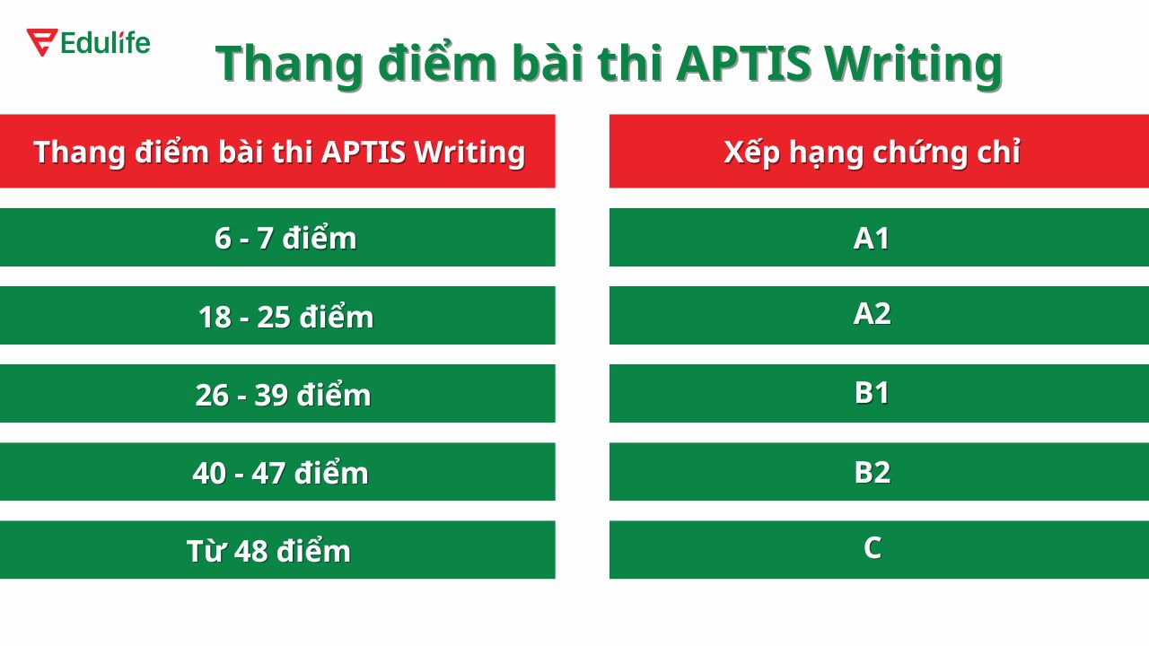 Thang điểm của bài thi APTIS Writing thường dao động từ 0 – 50 điểm. Điểm số này sẽ được quy đổi sang các cấp độ tương ứng trong Khung tham chiếu Châu Âu (CEFR). Cụ thể: