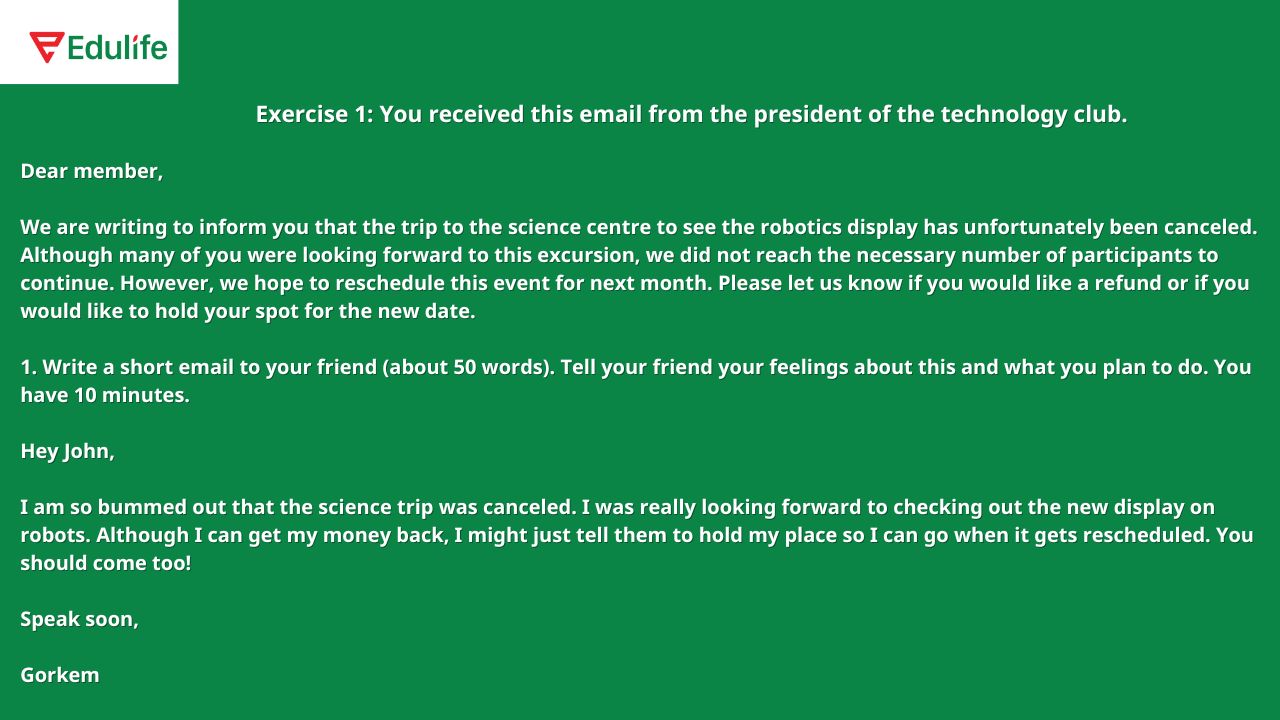 - Write an email to the coordinator of the club (about 120-150 words). Tell them your thoughts about this and what you would like to do. You have 20 minutes.