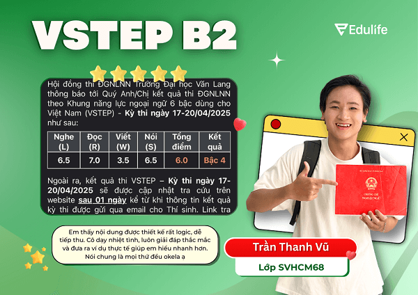 Edulife là 1 trung tâm đào tạo và cấp chứng chỉ Tiếng Anh hàng đầu Việt Nam. Với đội ngũ giảng viên uy tín các bạn sẽ được tiếp xúc với các phương pháp học đơn giản, dễ hiểu và mang lại hiệu quả cao nhất.