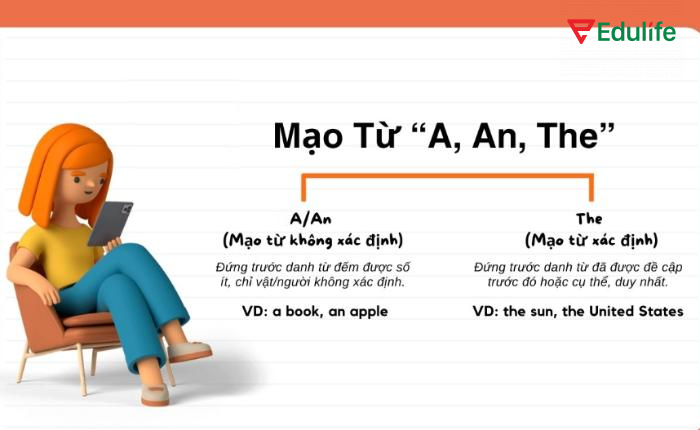 Mạo từ trong tiếng Anh là từ đứng trước danh từ để xác định tính xác định hoặc không xác định của danh từ đó với ba loại mạo từ chính là: a, an và the.
