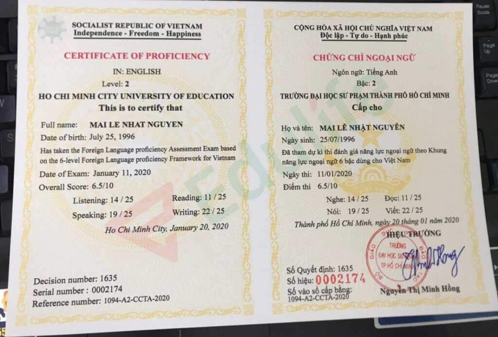 Mẫu chứng chỉ tiếng Anh A2 Đại học Sư phạm TP.HCM