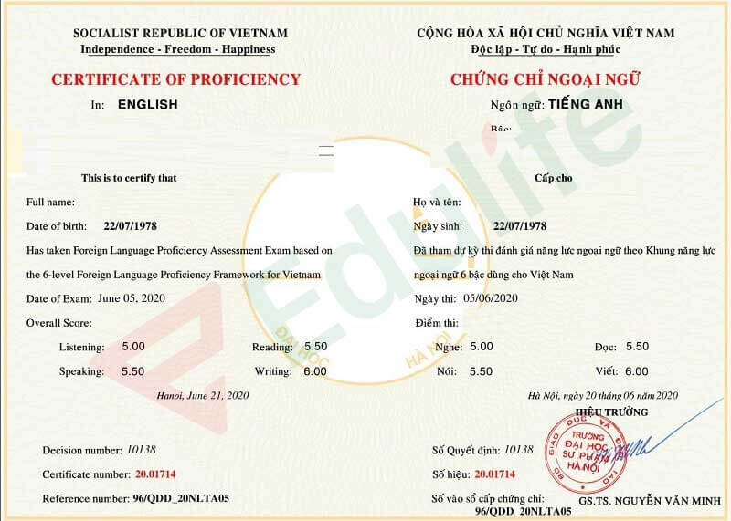 Mẫu chứng chỉ tiếng anh A2 của Đại Học Sư Phạm Hà Nội