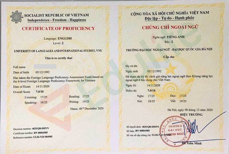 Mẫu chứng chỉ tiếng anh A2 của Đại Học Ngoại ngữ