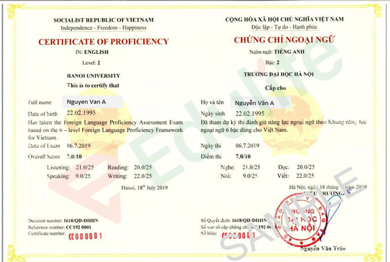 Mẫu chứng chỉ tiếng Anh A2 Đại Học Hà Nội