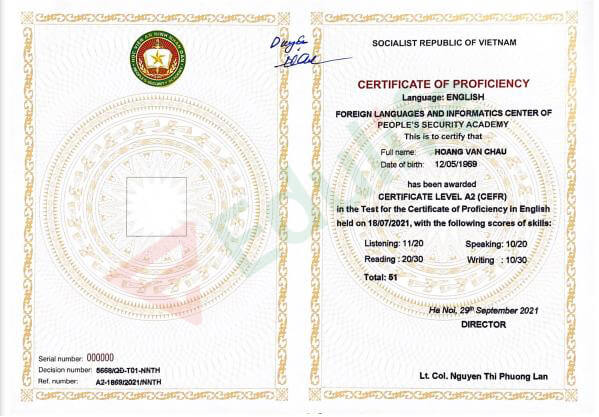Mẫu chứng chỉ tiếng Anh A2 Học viện An ninh nhân dân
