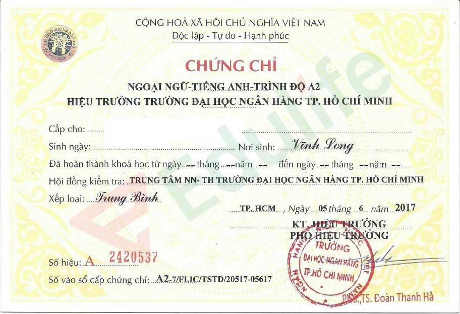 Mẫu chứng chỉ tiếng Anh A2 Đại học Ngân hàng TPHCM