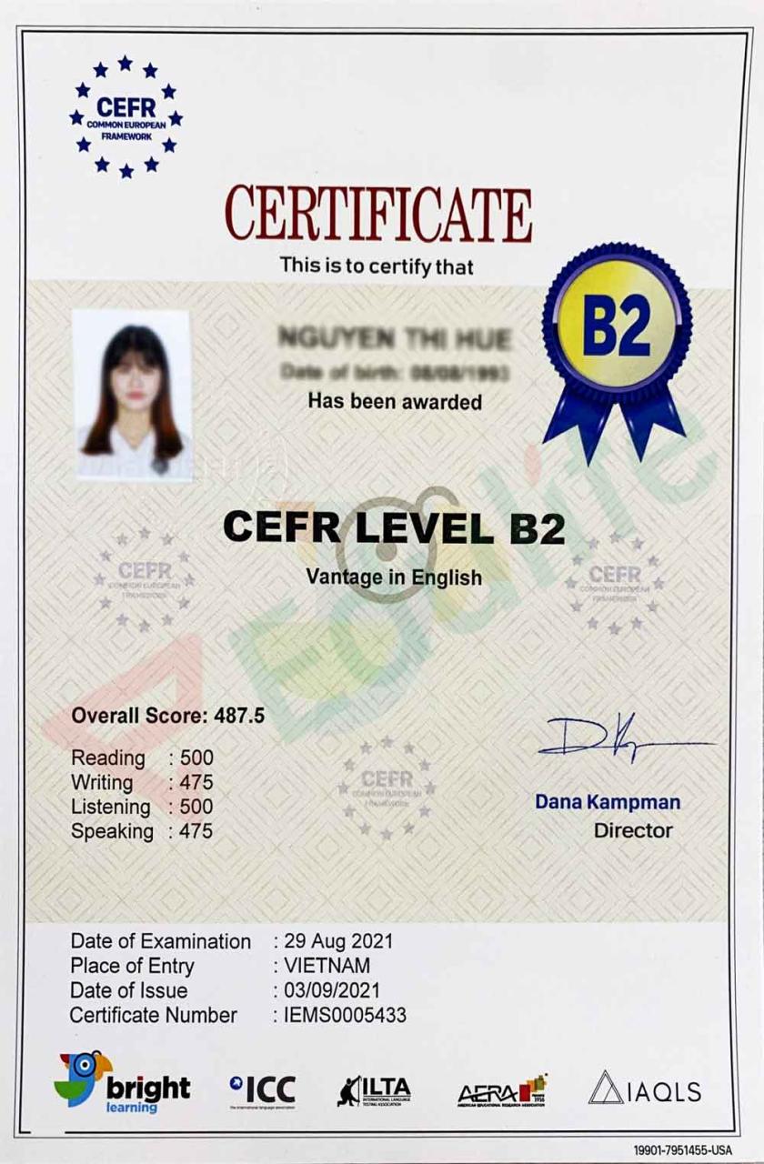 Mẫu chứng chỉ tiếng anh B2 của Bộ Giáo dục