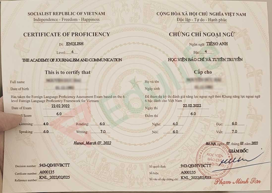 Mẫu chứng chỉ B2 Học viện Báo chí