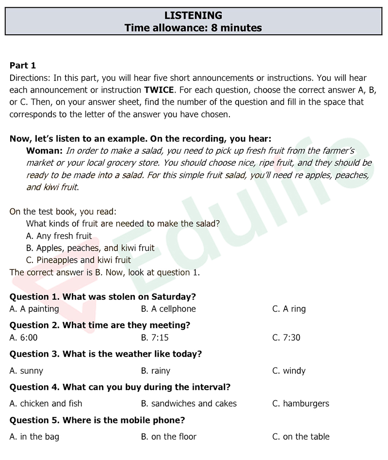 - Phần 5: Thí sinh nên đọc và nghe hướng dẫn, đọc các câu hỏi để nắm được ngữ cảnh trong đoạn hội thoại. Áp dụng cách nghe và làm bài tương tự phần 4 ở trên.