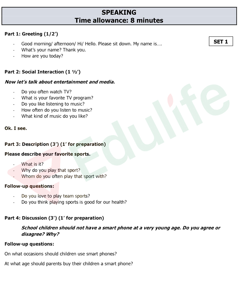 Phần 1, 2: Giám khảo sẽ tham gia hội thoại và đặt câu hỏi cho bạn về thông tin cá nhân và trao đổi tương tác về những chủ đề thông dụng như sở thích, công việc…