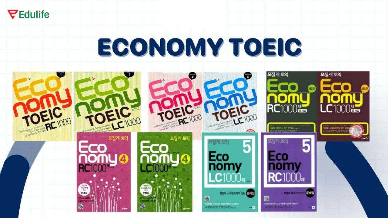Bộ sách Economy TOEIC là bộ **đề thi thử TOEIC** nổi tiếng, được thiết kế theo 5 Volume từ cơ bản đến nâng cao. Điểm đặc biệt của bộ sách này là tốc độ đọc trong phần nghe tăng dần qua các Volume, giúp người học làm quen với nhiều tốc độ và giọng đọc khác nhau, sát với bài thi thực tế. Mỗi Volume gồm hai cuốn riêng biệt cho LC và RC.