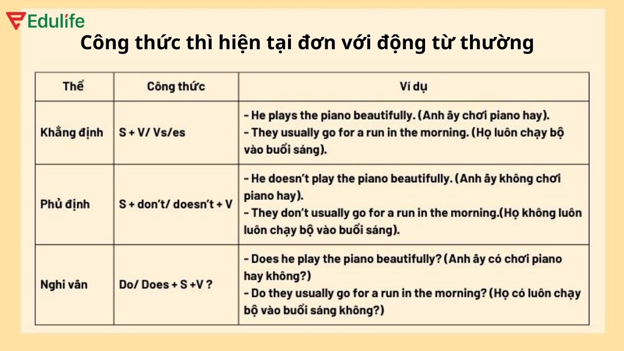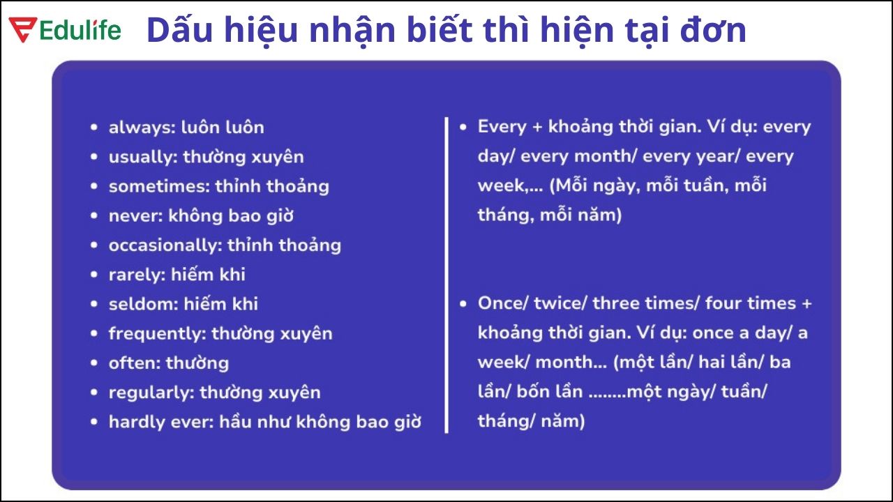 Thì hiện tại đơn (Present Simple) là một trong những thì quan trọng trong tiếng Anh, được sử dụng thường xuyên trong giao tiếp và công việc. Việc nắm vững kiến thức về thì hiện tại đơn giúp bạn sử dụng tiếng Anh một cách hiệu quả. Nội dung bài viết dưới đây, Edulife sẽ cung cấp cho bạn hệ thống kiến thức thì hiện tại đơn đầy đủ và chi tiết nhất. Xin mời các bạn cùng theo dõi!