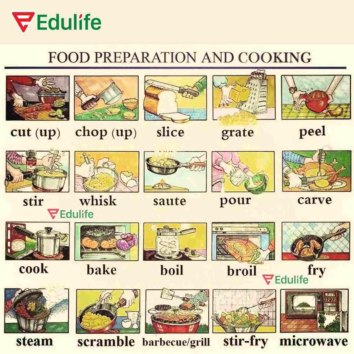 Nấu ăn là một chuỗi các hành động và quy trình. Dưới đây là các động từ thông dụng mô tả các phương pháp nấu nướng và chuẩn bị thực phẩm: