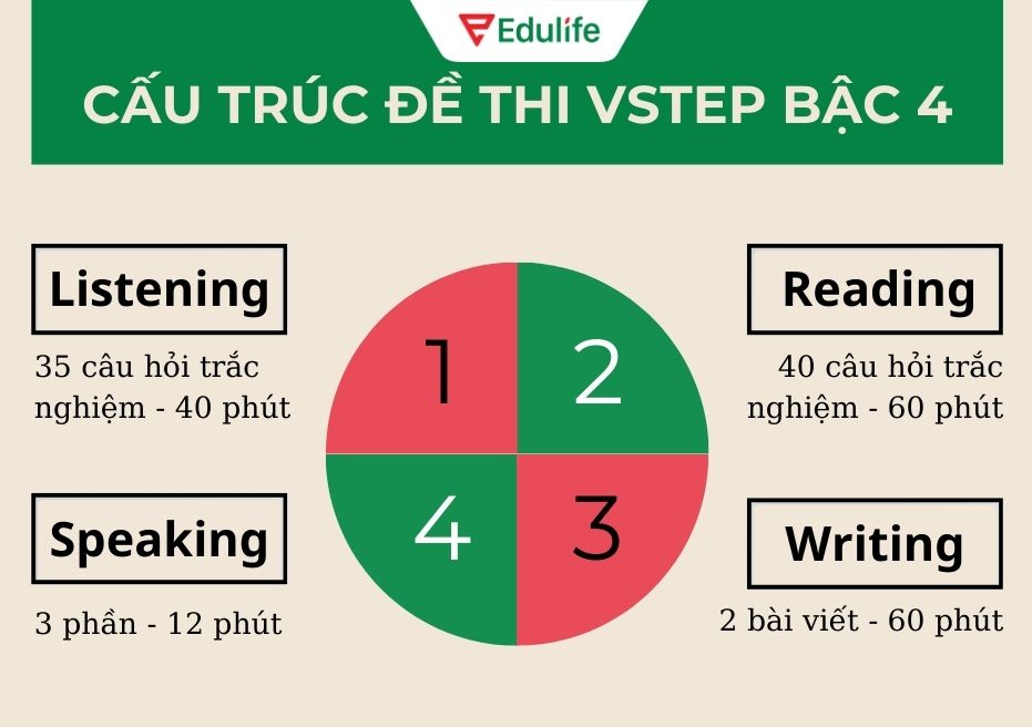 Cấu trúc đề thi VSTEP bậc 4 gồm 4 phần, lần lượt là VSTEP Listening, VSTEP Reading, VSTEP Writing và VSTEP Speaking. Cụ thể: