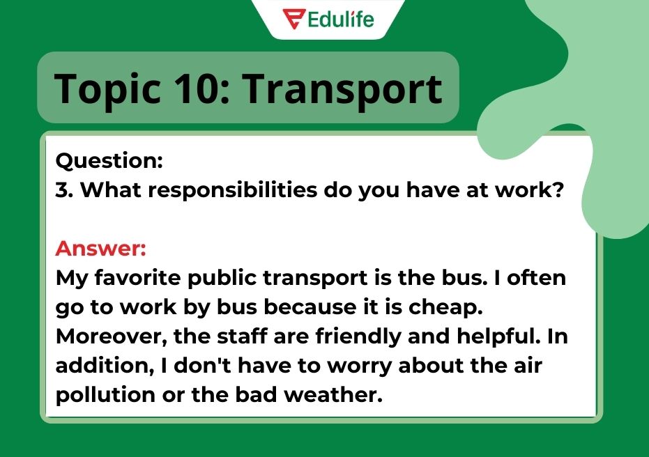 => My favorite public transport is the bus. I often go to work by bus because it is cheap. Moreover, the staff are friendly and helpful. In addition, I don’t have to worry about the air pollution or the bad weather.
